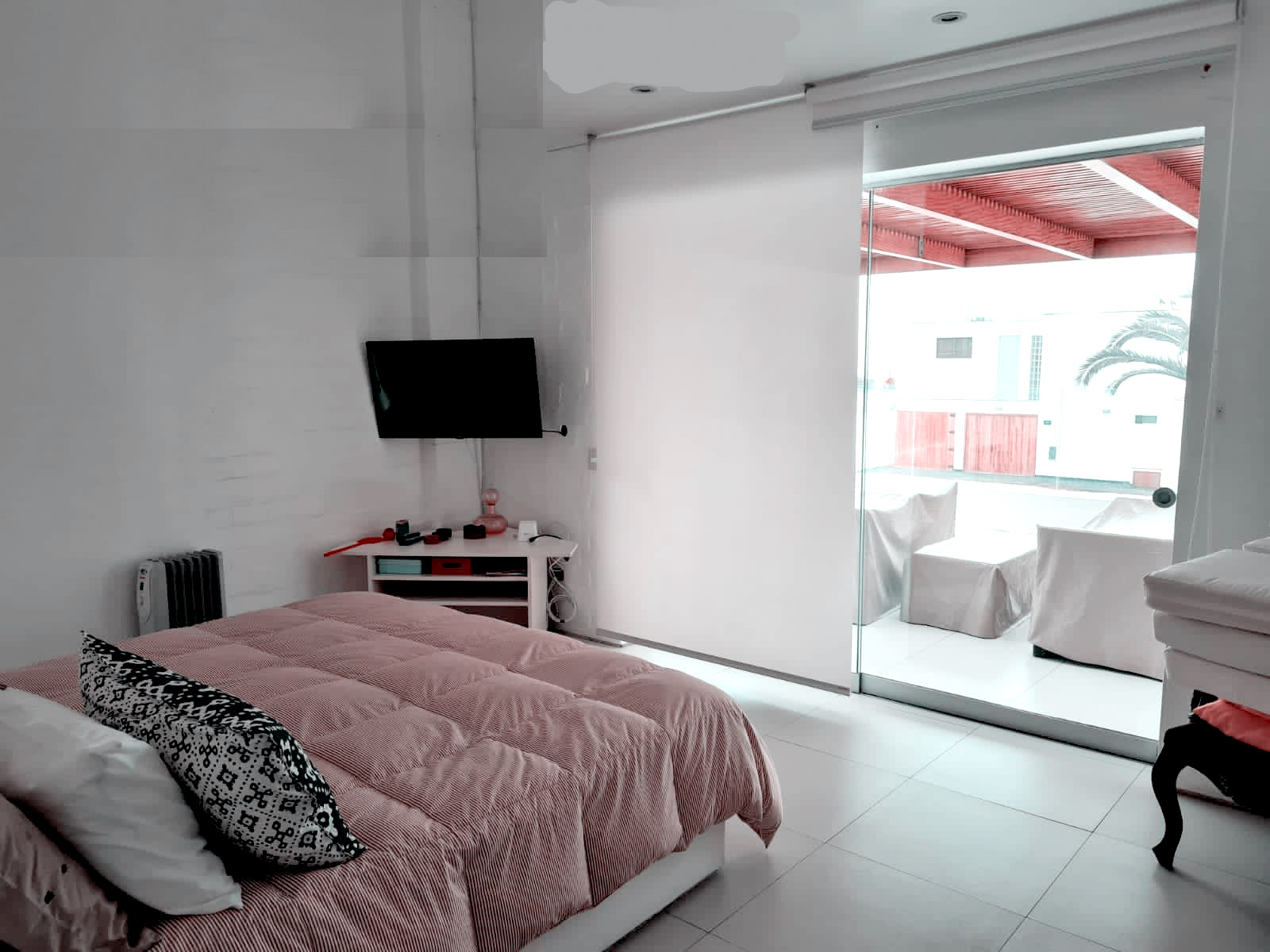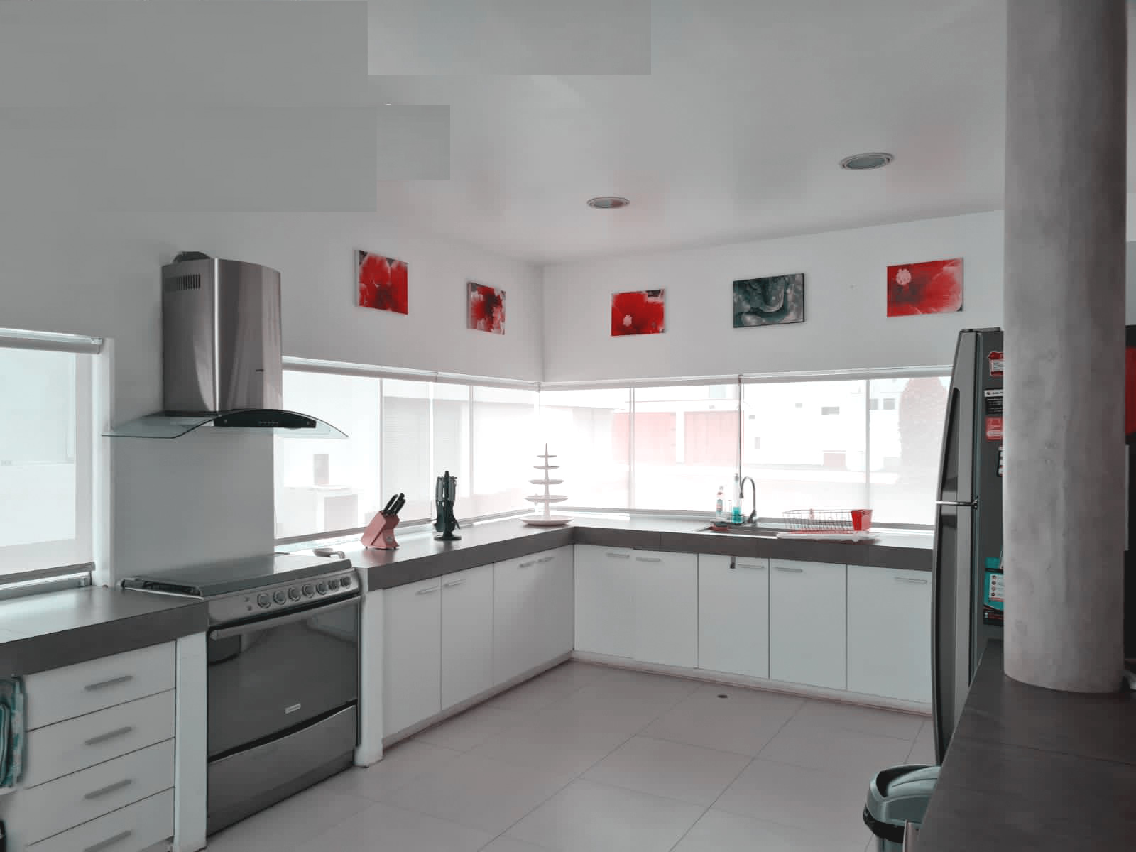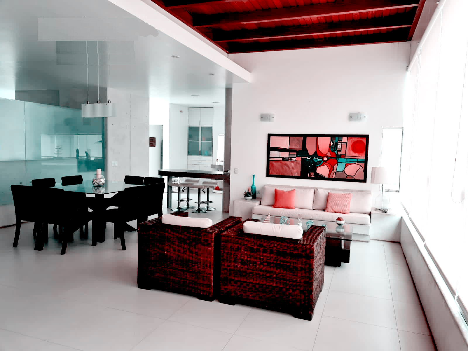 Sala, comedor, 4 dormitorios (dormitorio principal con terraza), capacidad para 9 personas, 4 baños, área de servicio, terraza en segundo piso, área de parrilla, piscina, lavadora, refrigeradora. 2 Estacionamientos y Estacionamiento visitas en el condominio.