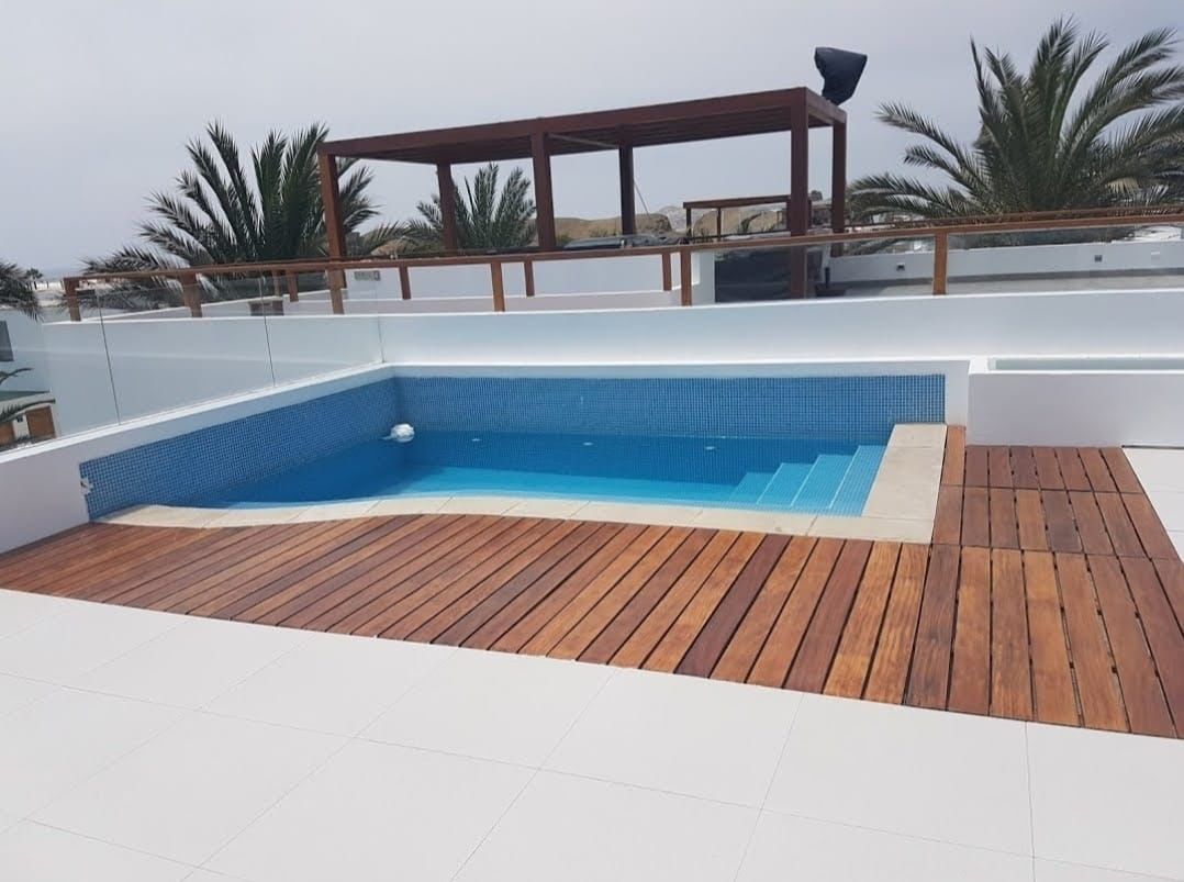 3er piso terraza, tiene área de parrilla, sala de terraza bajo techo sol y sombra, la piscina, mesa de fierro con vidrio de 6 sillas con sombrilla y parrilla de acero inoxidable y con caño al costado y vista al mar
